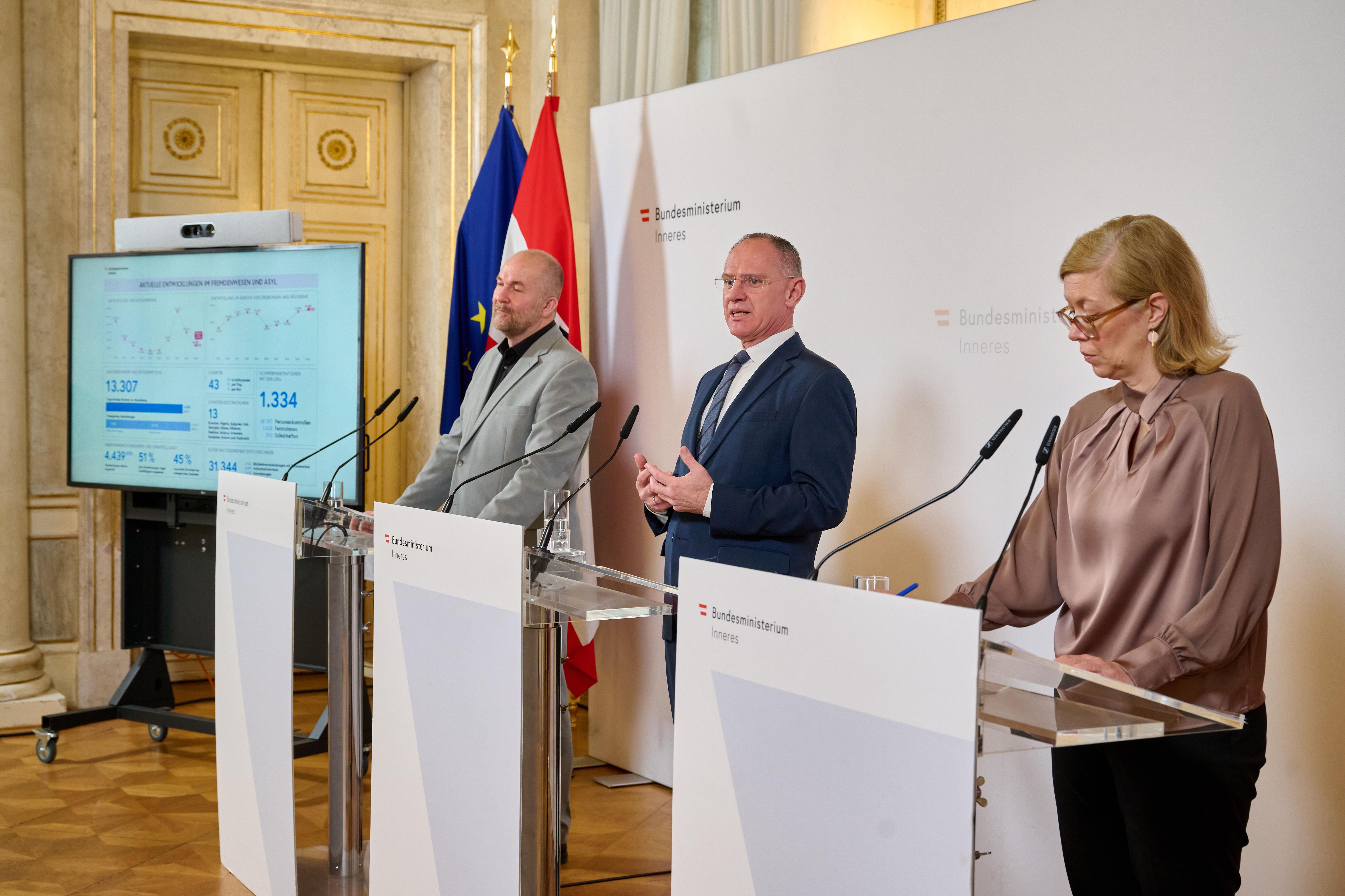 2024 wurden jeden Tag 36 Personen außer Landes gebracht, mit insgesamt 13.307 Personen wurde hier ein Plus von 3,2 Prozent im Vergleich zum Jahr davor erreicht – so viele wie noch nie seit Bestehen des BFA. "Wer in Österreich schwere Straftaten begeht, hat hier keinen Platz. Egal, ob er aus einem EU-Mitgliedsland, aus einem anderen europäischen Staat oder von einem anderen Kontinent kommt", sagte der Innenminister. "Gleichzeitig muss eine glaubwürdige, gerechte und strenge Asylpolitik auch konsequente Abschiebungen durchführen. Jene, die kein Recht haben, oder die ihr Recht verwirkt haben, in Österreich zu bleiben, werden abgeschoben."