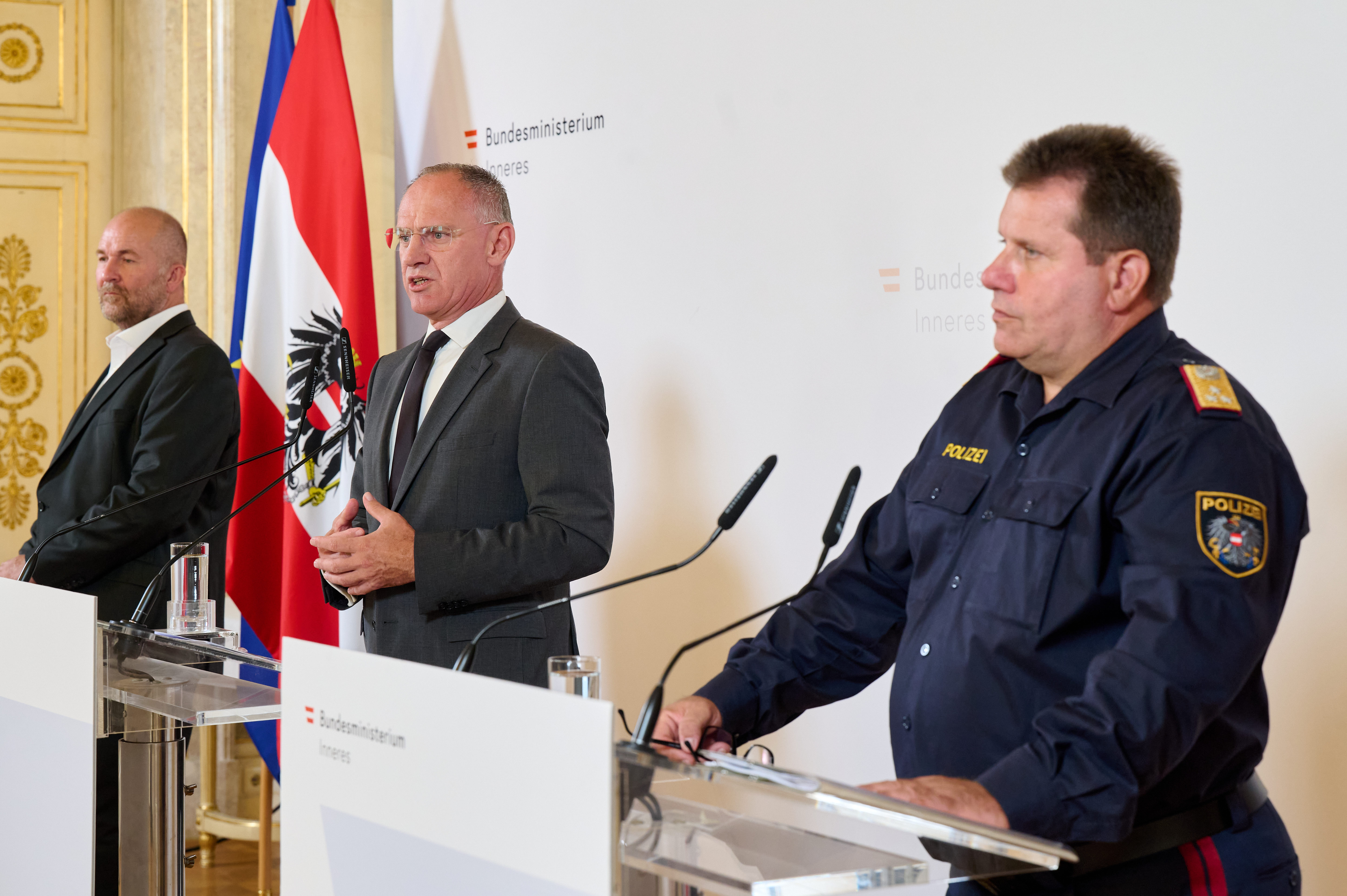 Innenminister Gerhard Karner, Bundespolizeidirektor Michael Takacs und Gernot Maier, Direktor des Bundesamtes für Fremdenwesen und Asyl (BFA), informierten am 4. September 2024 über aktuelle Maßnahmen im Kampf gegen Asylmissbrauch und zogen eine Zwischenbilanz.
